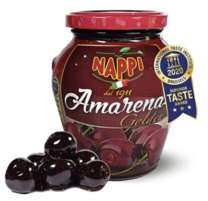 Italian amarena cherries produced by Nappi with premium Italian black cherries which are hand-picked and preserved with a balance of tart and sweet.