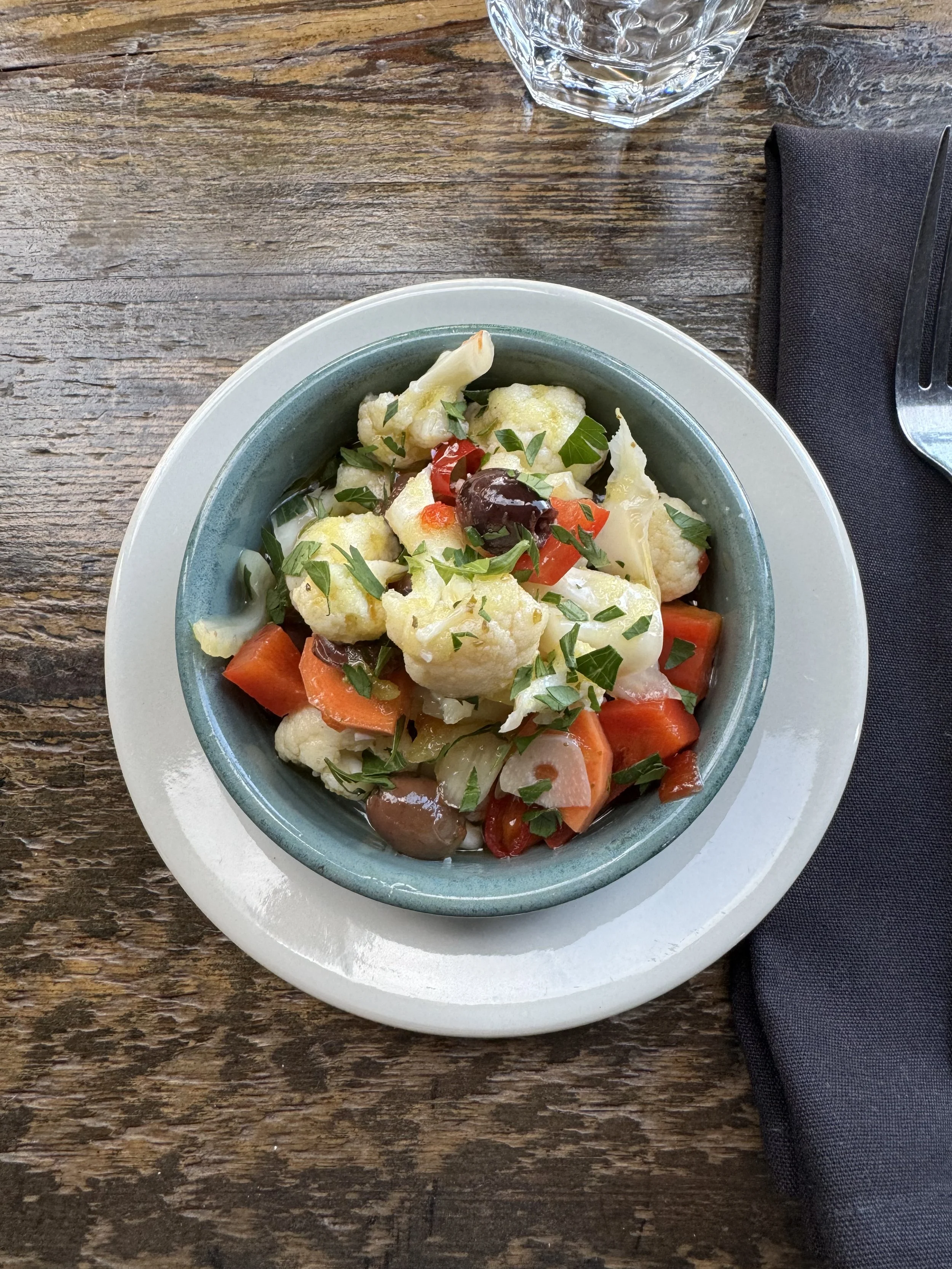 housemade spicy pickled summer vegetables with garlic, herbs, olives,